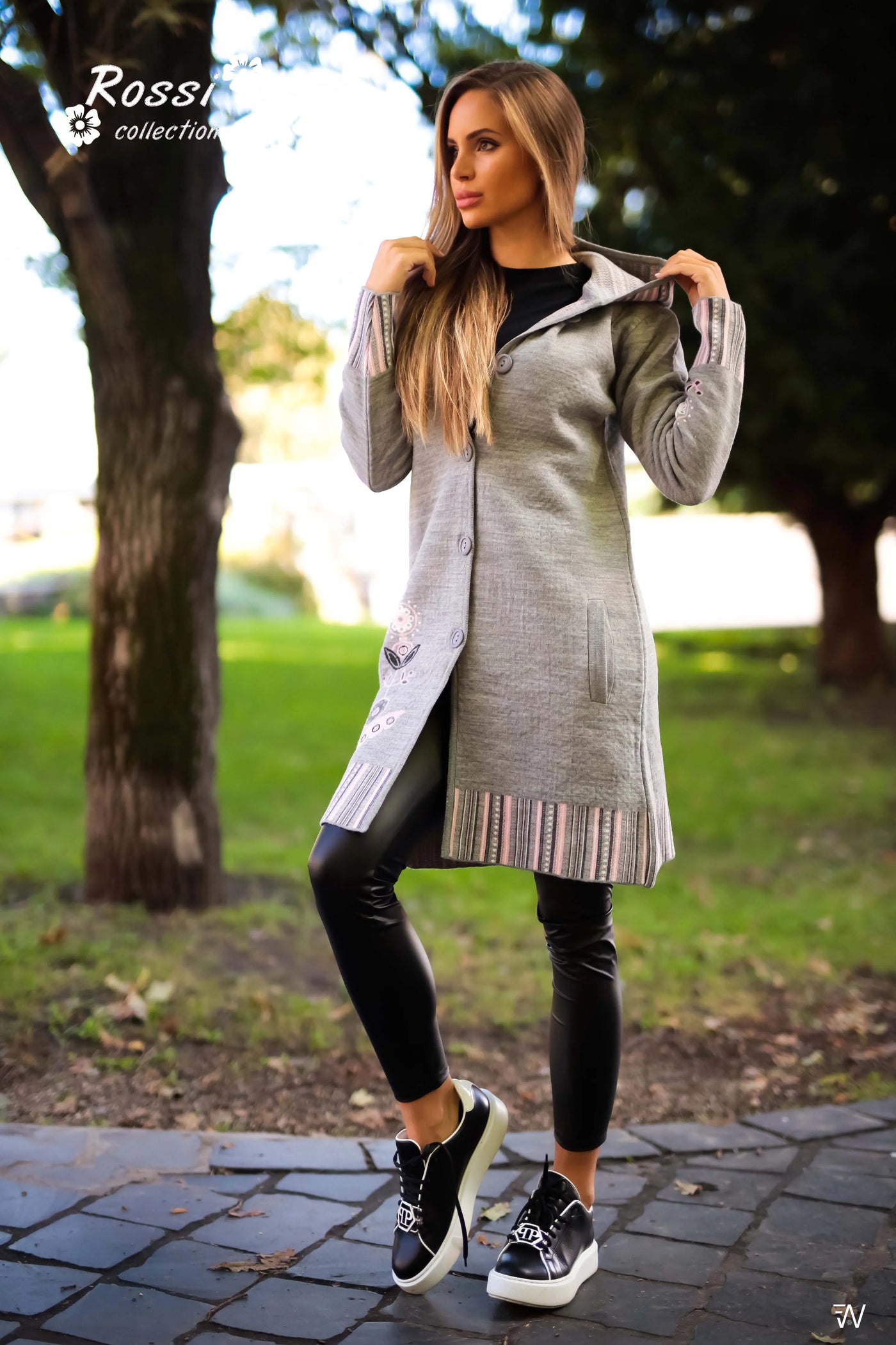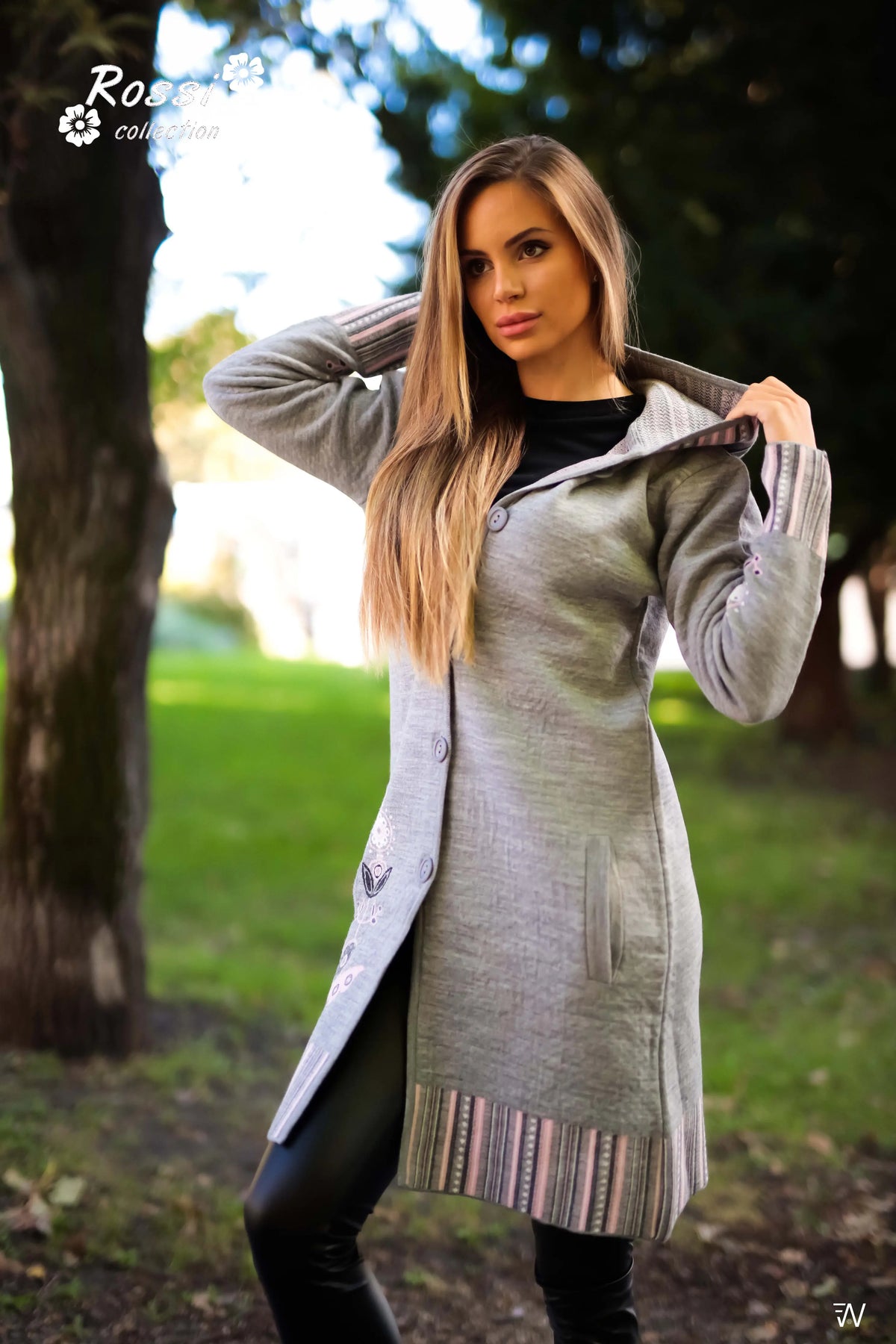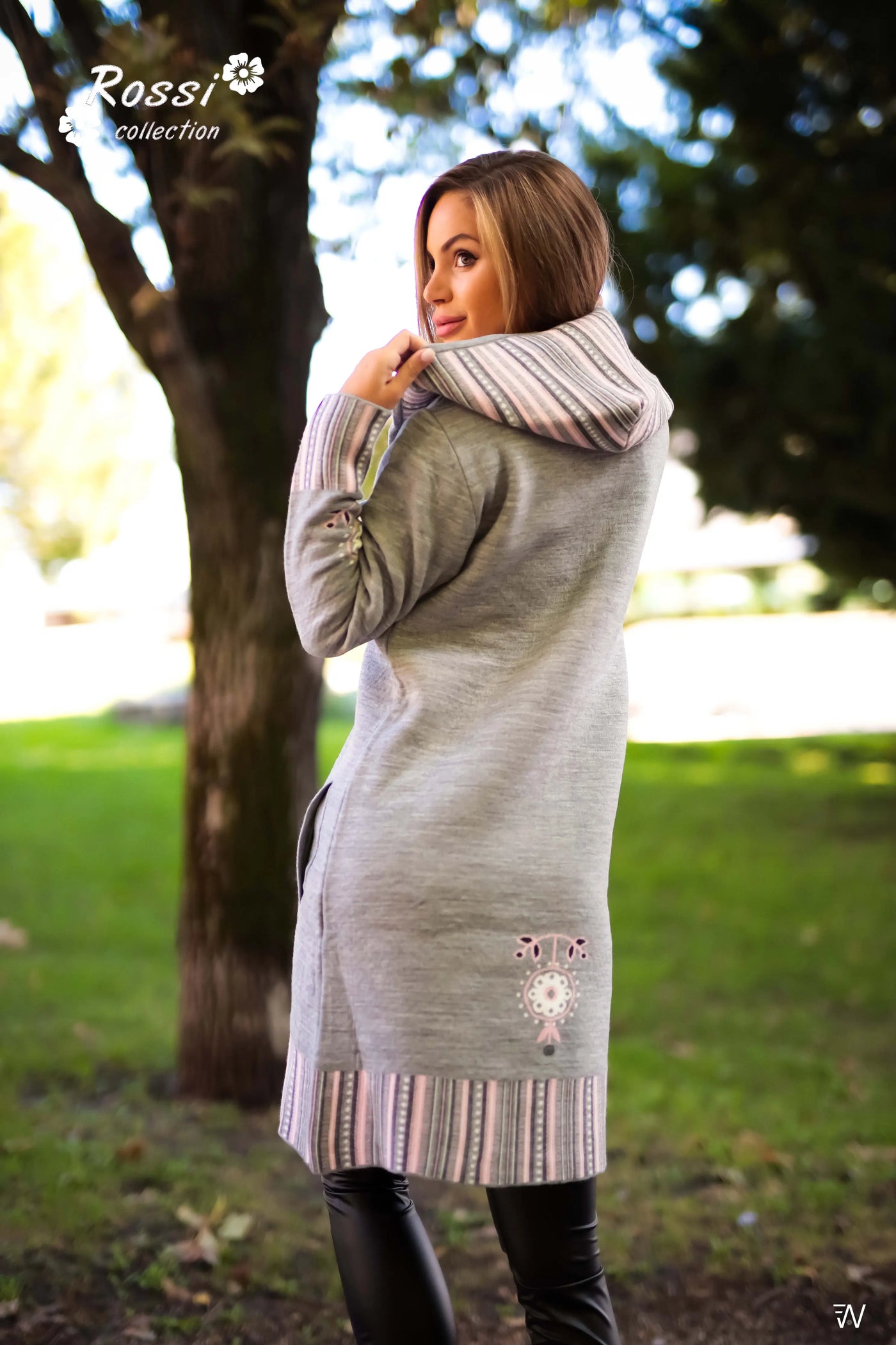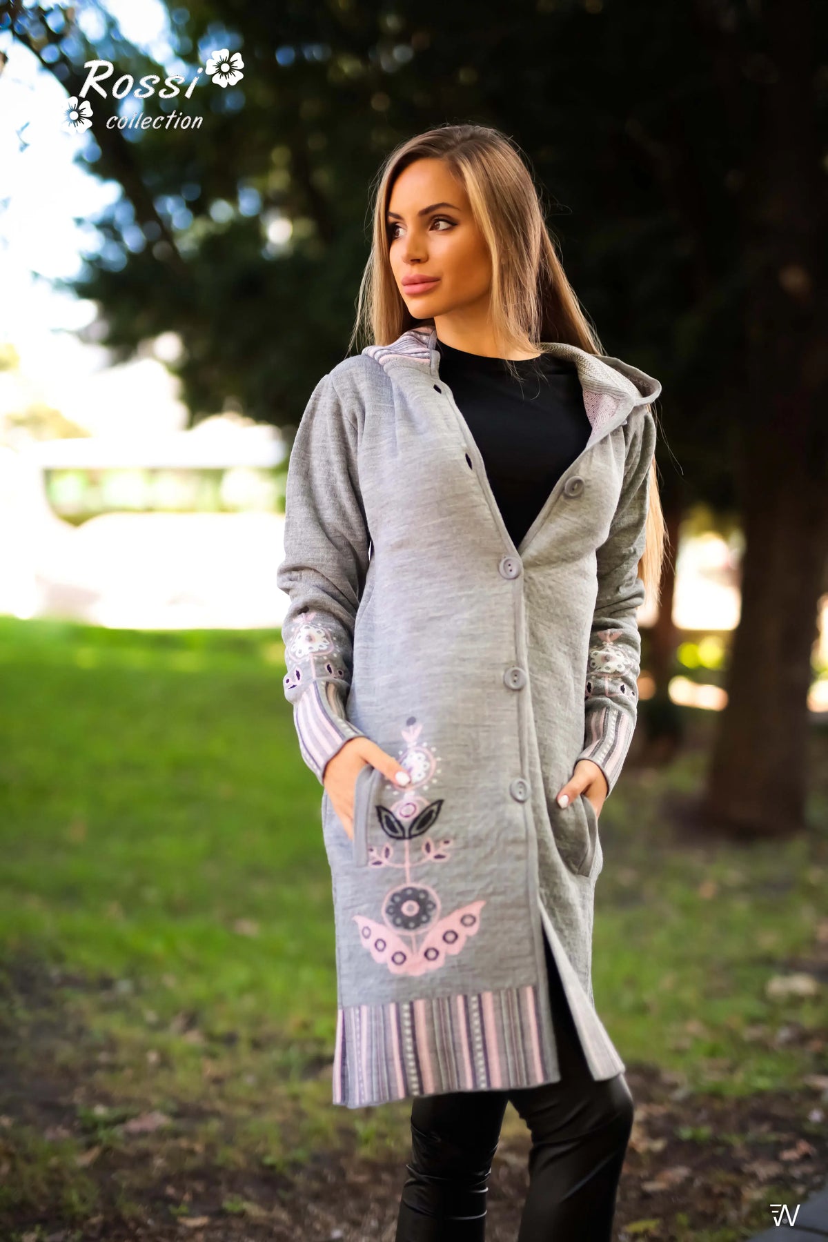 The Larisa jacket combines style and functionality with a flattering fit and a cozy hood that complements the design. A rich gray color adds to its appeal, making it a great choice for cooler days.