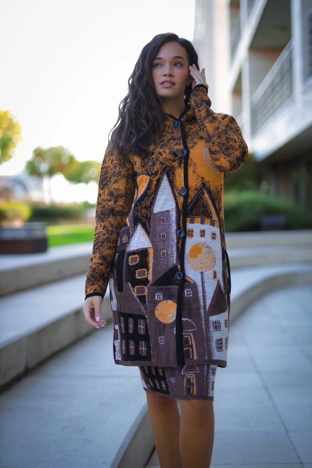 The Rebeka coat features a sophisticated mustard tone with a classic cut and delicate embroidered patterns. Crafted from a soft wool blend, it offers timeless sophistication and comfort, ideal for any wardrobe.
