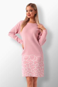 The Bellini knit dress offers timeless elegance with its textured animal print pattern on a warm pink base. With long sleeves and a round neck, this knee-length dress is perfect for both casual and formal occasions.