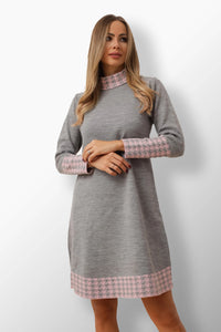 The Tekla knit dress exudes sophisticated style with its soft grey base and playful pink check pattern on the hem and cuffs. With a high neck and long sleeves, this knee-length design is versatile and stylish, perfect for any occasion.