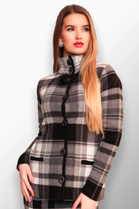 Model styled in a classic black and white plaid wool-blend short coat.