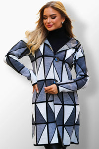 Combining style and functionality, this cardigan is the perfect accessory for cooler days. It features a comfortable hood and button closure, and the soft material keeps you warm. Its unique geometric pattern and combination of gray, black and white colors make it a fashionable and versatile piece, ideal for the fall-winter season.