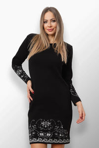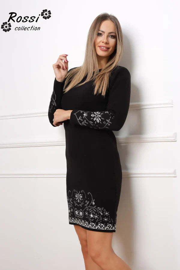 The Anila knit dress has a soft black base and is embellished with delicate white floral motifs. With a knee-length silhouette, round neck and long sleeves, this elegant design combines comfort and sophistication for versatile wear.