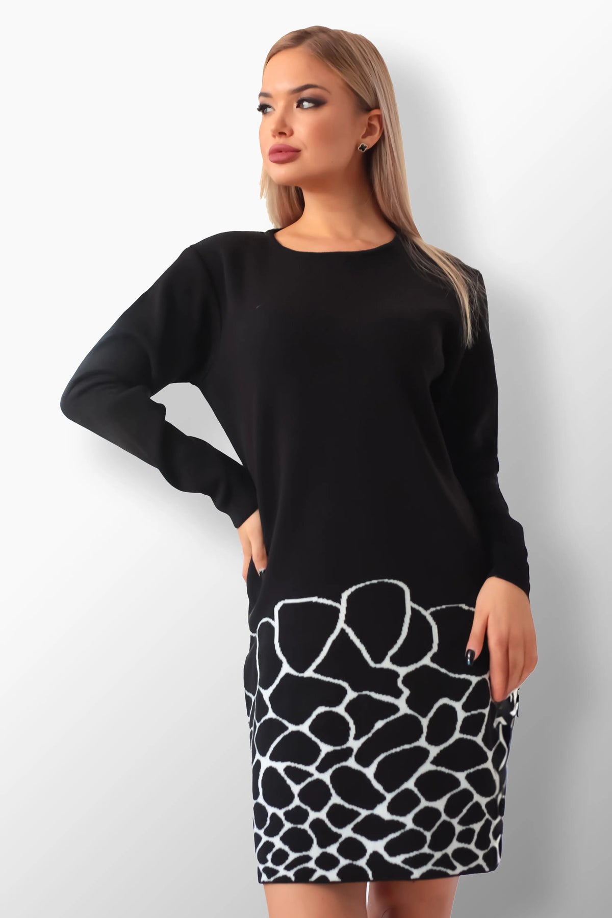 A Carolina kötött ruha ötvözi a meghitt bájt az időtlen eleganciával. Puha, finom kötésű anyagból készült, és különlegessége a ruha alján végigfutó egyedi állatmintás (pl. zsiráfmintás) szegély, amely minden színvariációban azonnal feltűnést kelt. Hosszú ujjú és klasszikus kerek nyakú kialakítása melegséget biztosít, míg a térdig érő sziluett tökéletes választás a sokoldalú stílushoz. Ideális alkalmi kirándulásokhoz, hétköznapi viselethez és különleges eseményekhez egyaránt.